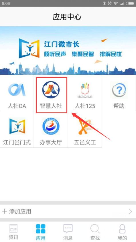 二、登录App,进入“应用”模块,点击“智慧人社”应用: