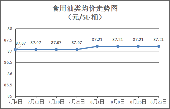 食用油类商品价格基本平稳。本周所监测的9种食用油(5L装)商品均价为87.21元/桶,环比持平。其中:金龙鱼花生油、大豆油、金龙调和油5L装零售均价分别为每桶112.50元、65元、74元,环比均持平。