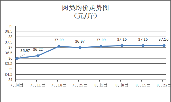 肉类商品价格总体平稳。本周所监测的8种肉类商品均价为37.16元/斤,环比持平。其中:排骨、有皮上肉、牛腩、带骨羊肉零售均价分别为每斤35.50元、18.50元、44元、49元,环比均持平。