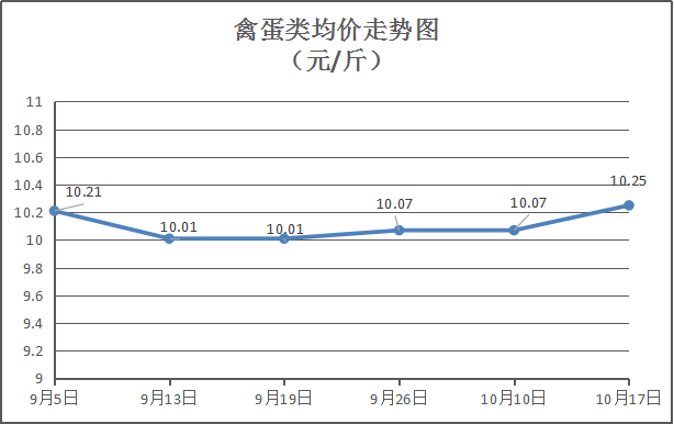 禽蛋类商品价格有所上涨。本周所监测的6种禽蛋类商品均价为10.25元/斤,环比上涨1.82%。其中:白条鸡、白条鸭、白壳鸡蛋、鸭蛋零售均价分别为每斤16元、15.5元,6.75元、7.75元,环比与上周分别持平、上涨6.9%、持平、上涨1.31%。