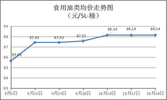 食用油类商品价格平稳。本周所监测的9种食用油(5L装)商品均价为88.14元/桶,环比均持平。其中:金龙鱼花生油、大豆油、金龙调和油5L装零售均价分别为每桶117.5元、65元、74元,环比与上周均持平。