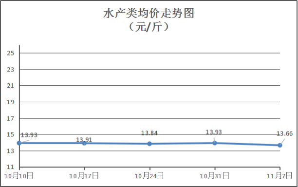 水产类商品价格小幅波动。所监测的11种水产品综合均价为13.66元/斤,环比下降1.94%。其中:草鱼、鲫鱼、鲈鱼、基围虾零售均价分别为每斤11.5元、13.25元、19.5元、32元,环比与上周分别上涨15%、上涨8.16%、持平、下降11.11%。