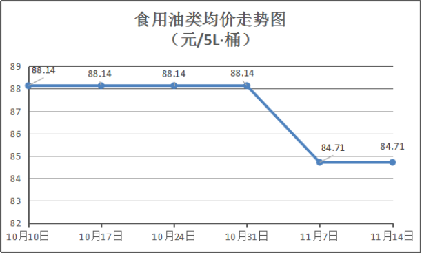 食用油类商品价格稳定。本周所监测的9种食用油(5L装)商品均价为84.71元/桶,环比均持平。其中:金龙鱼花生油、大豆油、金龙调和油5L装零售均价分别为每桶115元、65元、74元,环比与上周均持平。