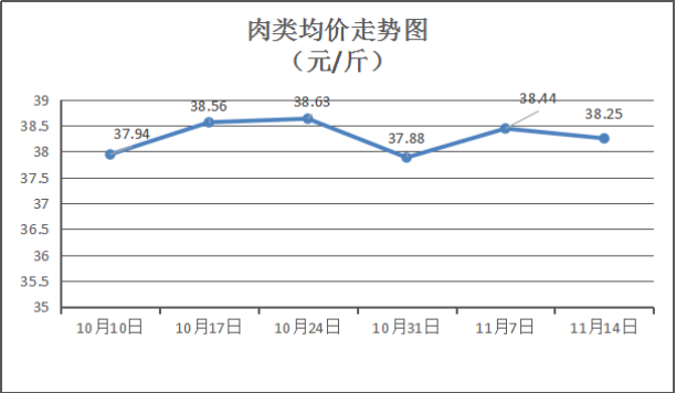 肉类商品价格略有下降。本周所监测的8种肉类商品均价为38.25元/斤,环比下降0.49%。其中:排骨、有皮上肉、牛腩、带骨羊肉零售均价分别为每斤36元、20.5元、54元、49元,环比与上周分别下降4%、持平、持平、持平。