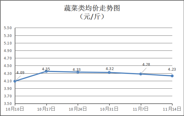 蔬菜类商品价格稳中微降。本周32种蔬菜价格波动情况为28平4跌,综合零售均价为4.23元/斤,环比下降1.17%。其中:4个品种零售均价环比下降,品种包括本地菜心、苦瓜、土豆零售均价分别为每斤5元、4.15元、3.15元,环比与上周分别下降9.09%、5.68%、16%;28个品种零售均价环比与上周持平。