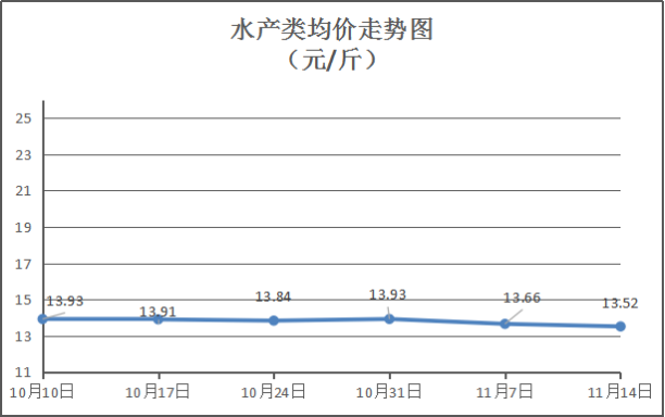 水产类商品价格微降。所监测的11种水产品综合均价为13.52元/斤,环比下降1.02%。其中:草鱼、鲫鱼、鲈鱼、基围虾零售均价分别为每斤10元、13.25元、19.5元、32元,环比与上周分别下降13.04%、持平、持平、持平。