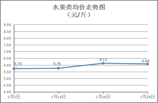 水果类商品价格下降。所监测的6种水果综合均价为6.08元/斤,环比下降0.82%。其中:橙子、苹果、梨零售均价分别为每斤6.00元、7.25元、5.00元,环比与上周分别持平、下降3.33%、持平。