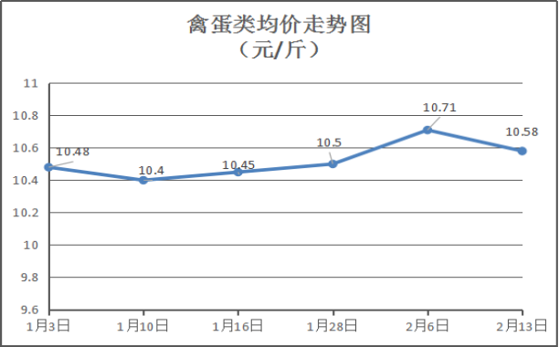 禽蛋类商品价格略有下降。本周所监测的6种禽蛋类商品均价为10.58元/斤,环比下降1.21%。其中:白条鸡、白条鸭、白壳鸡蛋、鸭蛋零售均价分别为每斤16.00元、15.50元、7.50元、8.00元,环比与上周分别持平、持平、下降3.23%、下降3.03%。