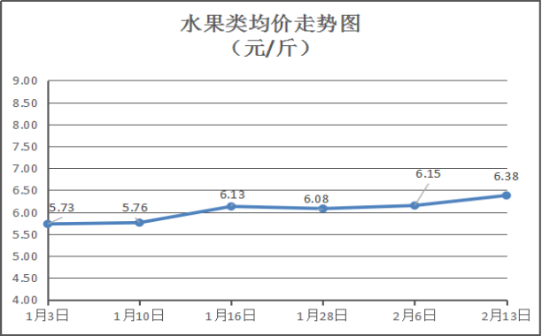 水果类商品价格上涨。所监测的6种水果综合均价为6.38元/斤,环比上涨3.74%。其中:橙子、苹果、梨零售均价分别为每斤6.00元、7.25元、5.25元,环比与上周分别下降2.44%、下降3.33%、上涨5.00%。