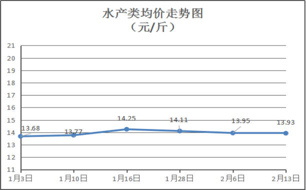 水产类商品价格微幅下降。所监测的11种水产品综合均价为13.93元/斤,环比下降0.14%。其中:草鱼、鲫鱼、鲈鱼、基围虾零售均价分别为每斤11.00元、12.50元、20.00元、35.00元,环比与上周分别持平、持平、持平、下降2.78%。
