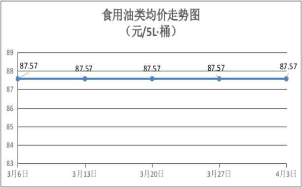 食用油类商品价格稳定。本周所监测的9种食用油(5L装)商品均价为87.57元/桶,环比均持平。其中:金龙鱼花生油、大豆油、金龙调和油5L装零售均价分别为每桶115元、65元、74元,环比与上周均持平。