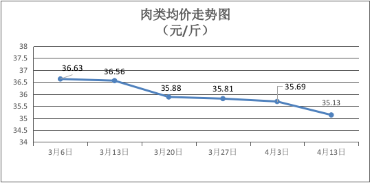 肉类商品价格总体下降。本周所监测的8种肉类商品均价为35.13元/斤,环比下降1.57%。其中:有皮上肉、排骨、精瘦肉零售均价分别为每斤15元、29元、19元,环比分别下降14.29%、下降7.94%、下降5.00%。