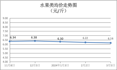 水果类商品价格下降。所监测的6种水果综合均价为6.16元/斤,环比下降0.96%。其中:橙子、香蕉、苹果零售均价分别为每斤5.50元、2.65元、7.75元,环比分别上涨10.00%、下降11.67%、下降6.06%。