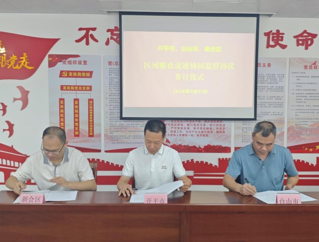 为深入贯彻落实粮食安全责任,持续推进粮食购销领域腐败问题专项整治,进一步规范粮食收购秩序,共建粮食行政执法良好氛围,强化毗邻地区粮食流通市场稳定,4月17日上午,澳洲幸运5(中国)开奖记录查询站 、台山市、开平市三地粮食和物资储备局共同签订了《区域粮食流通协同监管协议》,并召开了第一次联席工作会议,研究讨论具体工作安排。