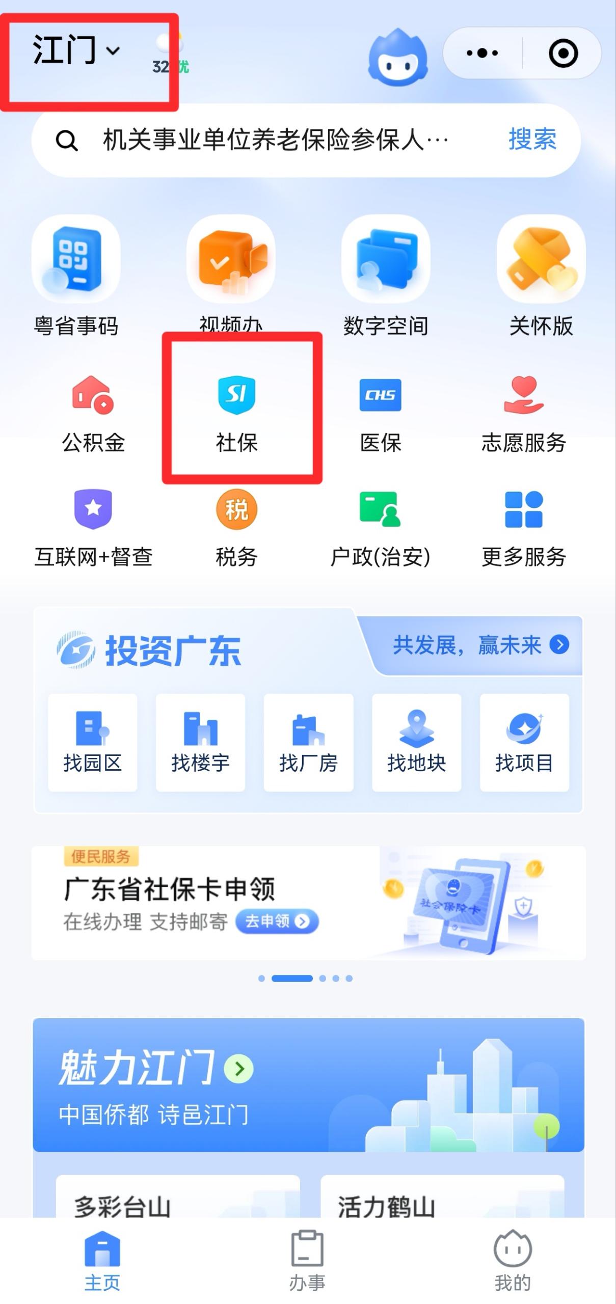 1、手机微信APP搜索“粤省事”小程序,左上角参保地切换为“江门市”,澳洲幸运5点击“社保”进入江门社保业务大厅。