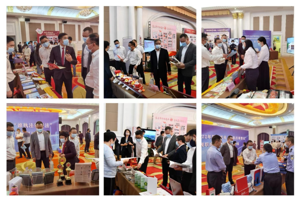 评议现场设置普法工作展示区,6个被评议单位以图片、视频、书籍、普法文创产品等生动形式展示各自普法工作成果,与会人员参观展摊的同时与被评议单位工作人员亲切交流,达到相互学习,相互促进的良好效果。