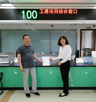 2021年4月8日下午,区统计局法规执法股负责人陈兆昌(左)将《依法统计告知书》交区住建局窗口组长凌莲庆(右)在工建项目综合窗口向固定资产投资项目办理报建时发放。