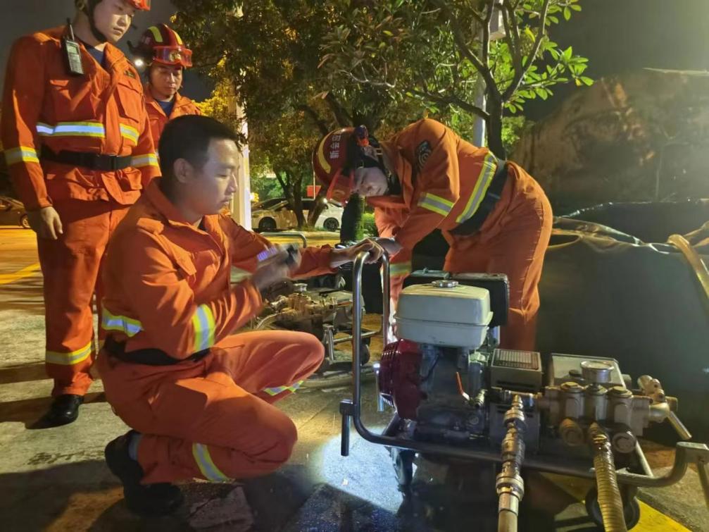 本次演练,模拟荔枝山突发森林火灾,区应急救援大队在执行扑救火灾任务时,及时排除机具“故障”,测试各类装备灭火功能和效果。大队到达“火场”后,迅速搭建前方指挥部;无人机手驾驶无人机环绕“火场”风向、火线长度及火势蔓延等信息;前线指挥长根据现场情况,将战斗员分为40mm插销式消防水带小组和25mm卡扣式消防水带小组,使用森林消防水罐车、储水水囊和65mm插销式消防水带为前线提供水源。期间,便携式抽水泵和高压远程柱塞泵分别出现供水水压不足和无法启动等“故障”,技术组立刻查找原因排除“故障”,保障扑“火”任务顺利进行。