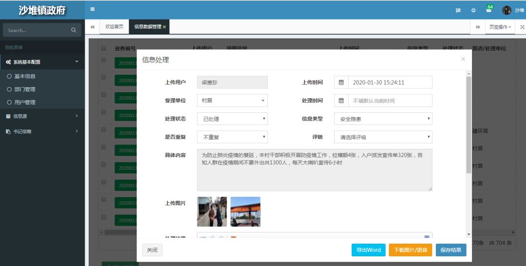 发动系统网格员、村(社区)专、兼职网格员、义工齐上阵,落实43个网格宣传发动、巡查登记,及时通过“微沙堆”上报疫情信息,防疫期间共收到信息96条,处理信息96条,落实当天信息当天处置,及时处置率100%。