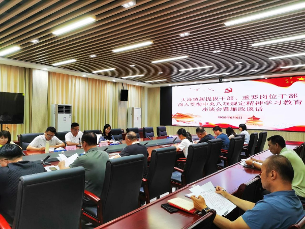 为持之以恒推进作风建设,筑牢党员干部拒腐防变思想防线,6月6日下午,大泽镇组织开展新提拔干部、关键岗位干部深入贯彻中央八项规定精神学习教育座谈会暨廉政谈话。会议由镇党委委员陈晓建主持,党委委员、纪委书记李文锋作廉政谈话,新提拔干部、关键岗位干部等共40人参会,以学促思、以谈明纪,推动中央八项规定精神落地生根。