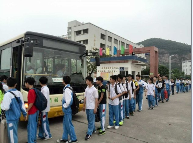 四中“校车服务专线”正式开通。首批400名学生分乘5辆专车,在老师的护导下回家。