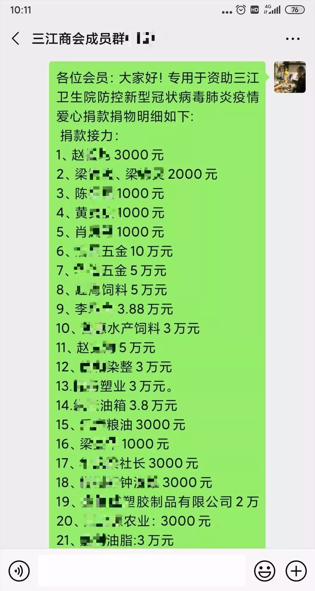 三江商会李景汉会长指出,在爱心接力捐款160万元中,捐款10万元以上企业有3家,捐款5万元至10万元之间企业有8家,捐款1万元至5万元之间企业有32家。党有号召,我们商界有行动!有钱出钱,有力出力。我们坚信,只要万众一心,同舟共济,共克难关,胜利的曙光一定很快到来!