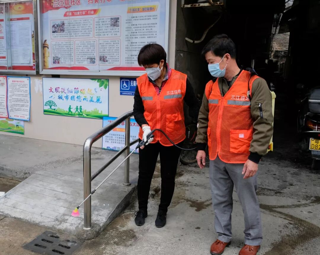 2月2日,三江镇发布疫情防控工作志愿者招募公告,三江商会党支部书记黄女庆立即报名参与,并发动本支部全体党员加入志愿行动。他们穿梭在大街小巷,不怕辛苦,或身背消毒水、手持喷枪在消毒,或高举宣传旗帜走街串巷向村民宣传防控知识,或深入住户排查登记外来人员情况等。