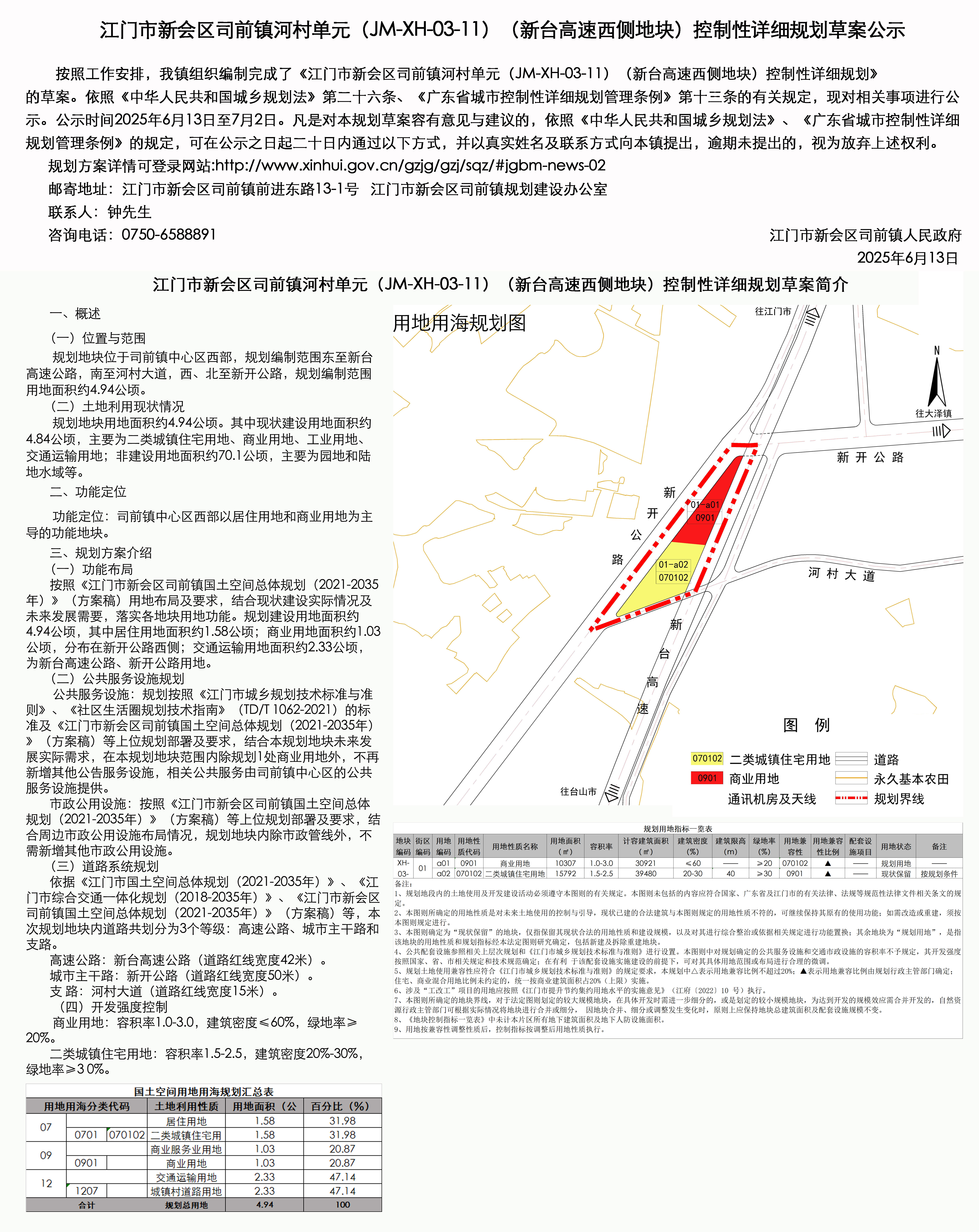 按照国土空间规划工作安排,我镇组织编制完成了《澳洲幸运5(中国)开奖记录查询站 司前镇河村单元(JM-XH-03-11)(迎宾南路西侧地块)控制性详细规划》《澳洲幸运5(中国)开奖记录查询站 司前镇河村单元(JM-XH-03-11)(新台高速西侧地块)控制性详细规划》的草案。依照《中华人民共和国城乡规划法》第二十六条、《广东省城市控制性详细规划管理条例》第十三条的有关规定,现对相关事项进行公示。公示时间2025年6月13日至7月2日。凡是对本规划草案容有意见与建议的,依照《中华人民共和国城乡规划法》、《广东省城市控制件详细规划管理条例》的规定,可在公示之日起三十日内通过以下方式向本单位提出申述,逾未提出的,视为放弃上述权利。