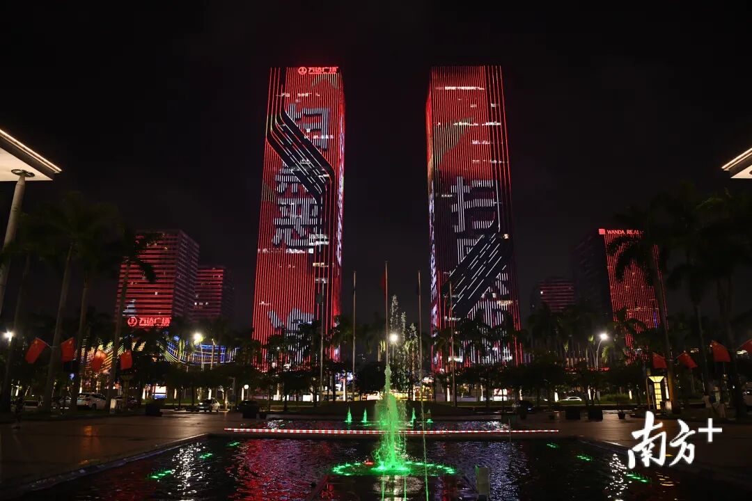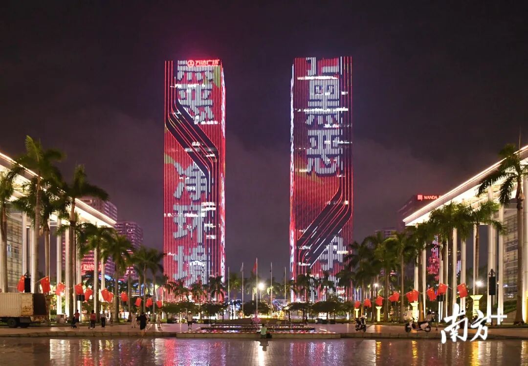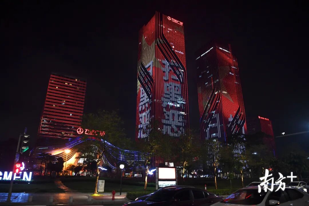 晚上8时,江门五邑华侨广场灯火璀璨,流光溢彩的动画灯光闪动在万达广场写字楼墙幕上,“扫黑恶 净环境 促稳定 保平安”十二个红色大字,赫然跃上高耸的楼宇……夜色中,扫黑除恶宣传光影掠动。