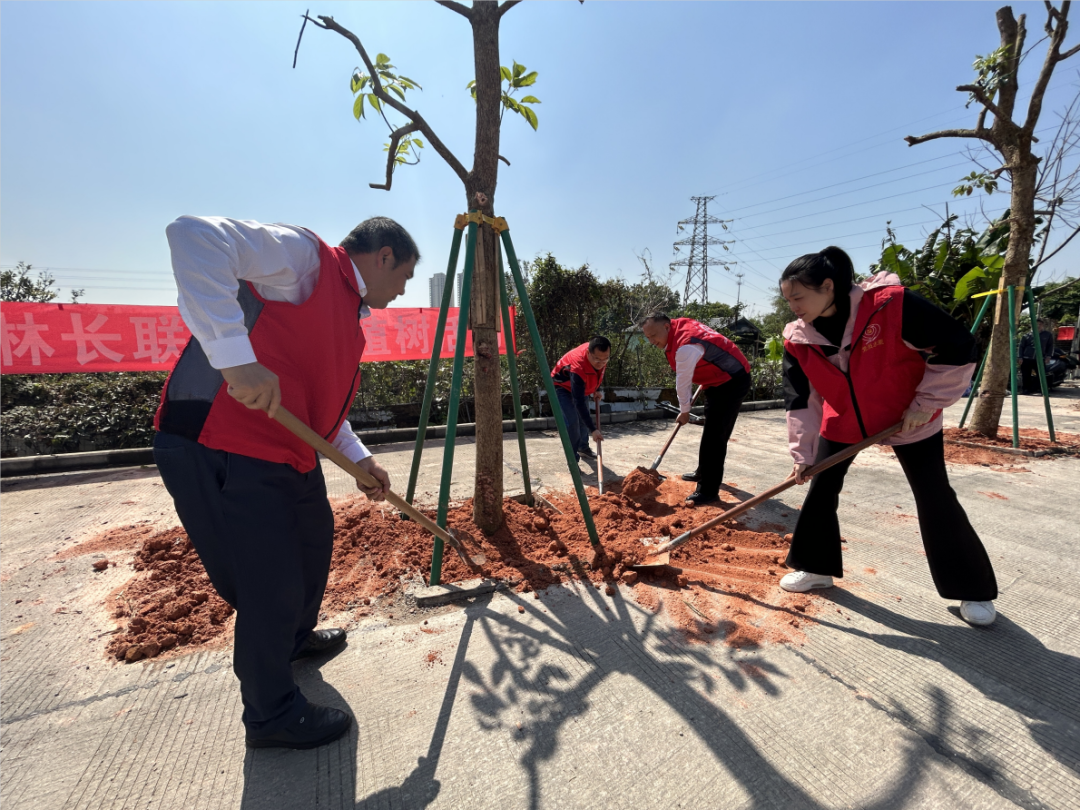 现场志愿者们干劲十足,几人一组,相互配合,一同挖坑铲土、扶树正苗、培土围堰、提水浇灌,各个环节衔接有序,场面异常火热。