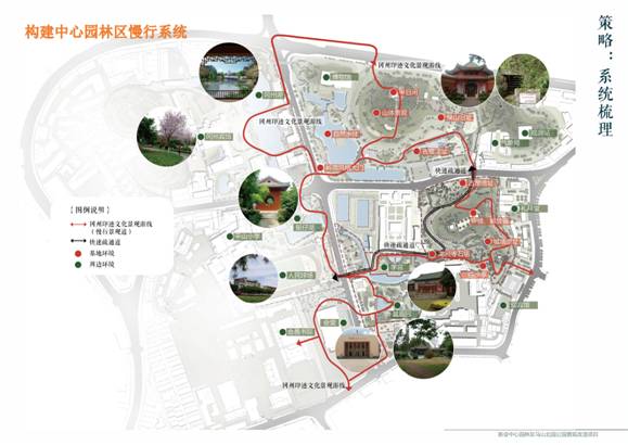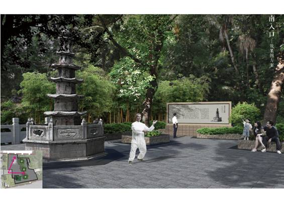 (二)改造南入口广场。修剪植物,将文物处于显著位置,新建景墙,附上龙兴寺石塔简介,以便游人全面认识了解石塔。对南入口铺装与倚马亭进行重新翻修,新增树池坐凳,将南入口营造出典雅、朴素、简远的风格意境。