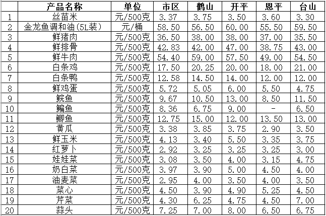 说明:1、表中价格为该地区监测点综合平均价;2、“市区”含蓬江区、江海区、澳洲幸运5(中国)开奖记录查询站 ,价格分别采自蓬江市场、江南市场、城东市场等6家农贸市场;3、其他四个县市价格分别采自新鹤市场、锦江市场等8家农贸市场。