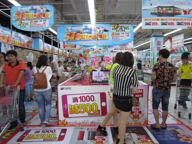 节日期间,我区各大商场超市根据实际开展线上线下同步打折促销、货品特价、会员优惠、增值服务等形式多样的促销活动,如大润发超市开展“家电大汇展,商品均一价”促销活动;壹加壹商场开展“五一家电节,欢购五重礼” 促销活动;国美电器“五一来国美,做省钱英雄” 促销活动等,激发广大市民的消费热情。并且利用户外LED、海报标语、车身广告等载体宣传造势,营造繁荣的消费气氛。