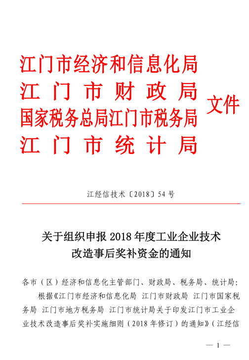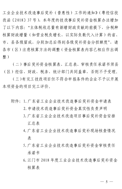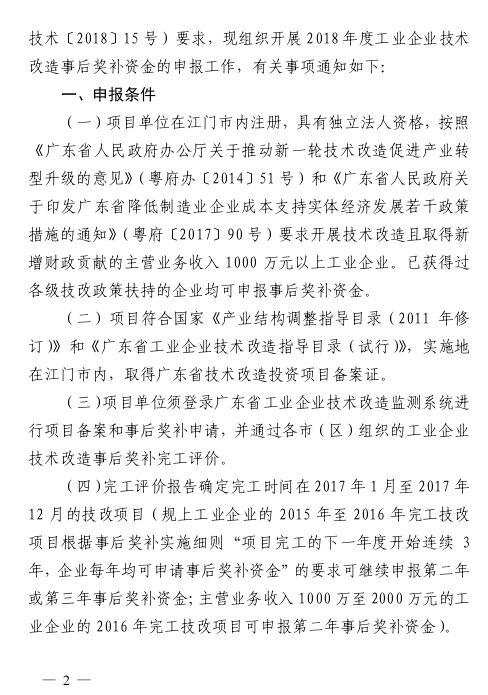 关于组织申报2018年度工业企业技术改造事后奖补资金的通知