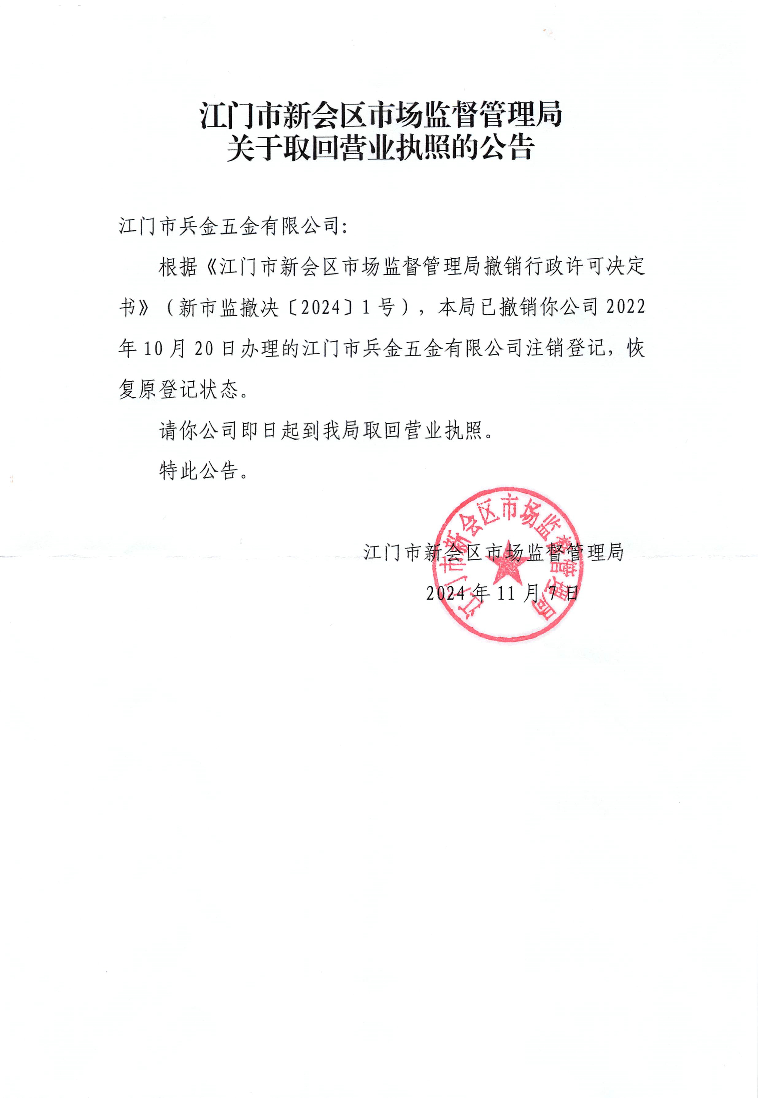 澳洲幸运5(中国)开奖记录查询站 市场监督管理局关于取回营业执照的公告(江门市兵金五金有限公司).jpg