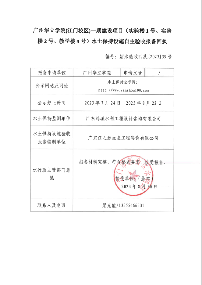 广州华立学院(江门校区)一期建设项目(实验楼1号、实验楼2号、教学楼4号)水土保持设施自主验收报备回执