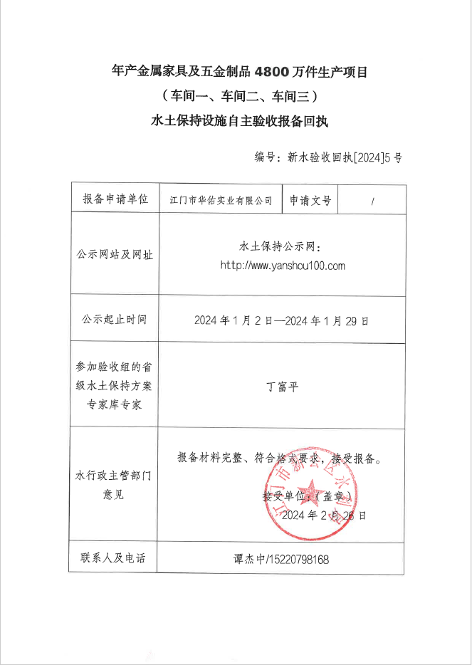 年产金属家具及五金制品4800万件生产项目(车间一、车间二、车间三)水土保持设施自主验收报备回执