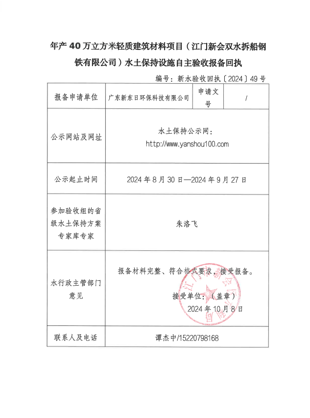年产40万立方米轻质建筑材料项目(江门澳洲幸运5 双水拆船钢铁有限公司)水土保持设施自主验收报备回执