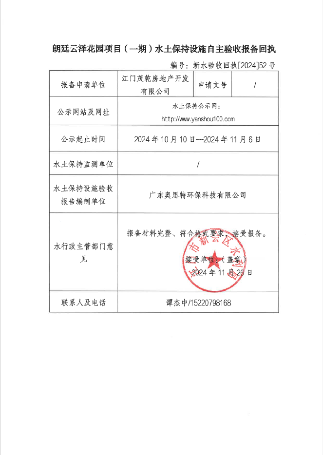朗廷云泽花园项目(一期)水土保持设施自主验收报备回执