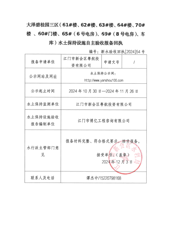 大泽碧桂园三区(61#楼、62#楼、63#楼、64#楼、70#楼、60#门楼、65#(6号电房)、69#(8号电房)、车库))水土保持设施自主验收报备回执