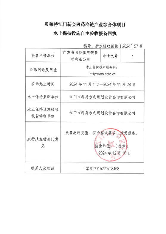 贝莱特江门澳洲幸运5 医药冷链产业综合体项目水土保持设施自主验收报备回执