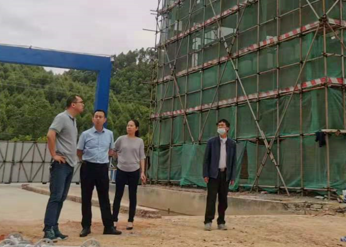 张伟健同志(左二)在罗坑镇党委副书记陈德斌同志(左一)陪同下到江门市中砼实业有限公司的混凝土搅拌设备和环保设备生产项目施工现场了解项目投资建设情况,并要求罗坑镇跟进投资项目直报工作,服务基层。