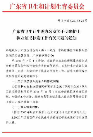 新卫办〔2017〕21号转发广东省卫生计生委办公室关于明确护士执业证书核发工作有关问题的通知
