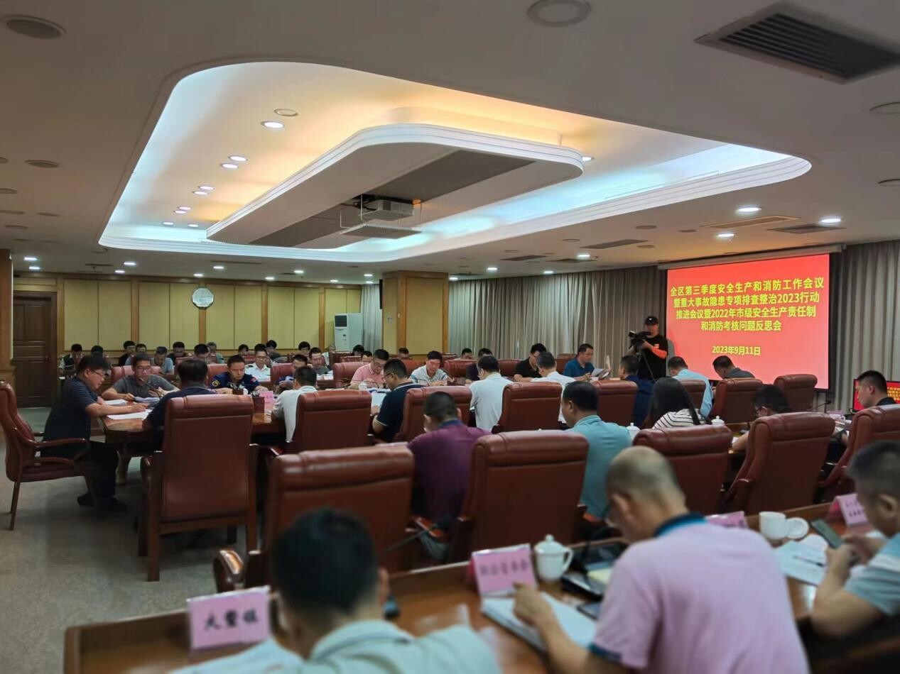 9月11日下午,区委、区政府组织召开全区第三季度安全生产和消防工作会议暨重大事故隐患专项排查整治2023行动推进会议暨2022年市级安全生产责任制和消防考核问题反思会。区委常委、副区长钟文明出席会议并讲话,区应急管理局、区消防救援大队主要领导,各镇(街、区)、区安委会成员单位分管领导等约60多人参加会议。会议深入剖析我区安全生产和消防工作存在短板和问题,锚定系统完善完成全年工作任务的目标,部署今年下阶段全面做好安全防范的各项工作,确保全区安全形势安全稳定。