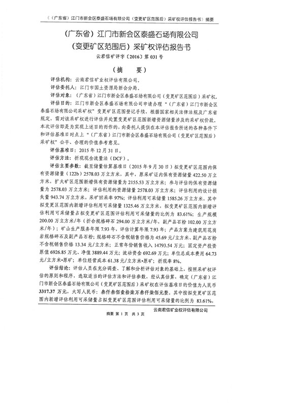 崖门镇泰盛石场五马同槽矿区采矿权变更矿区范围后新增花岗岩资源进行价款评估。现根据有关规定对评估结果在江门市国土资源局澳洲幸运5