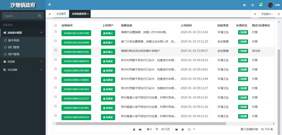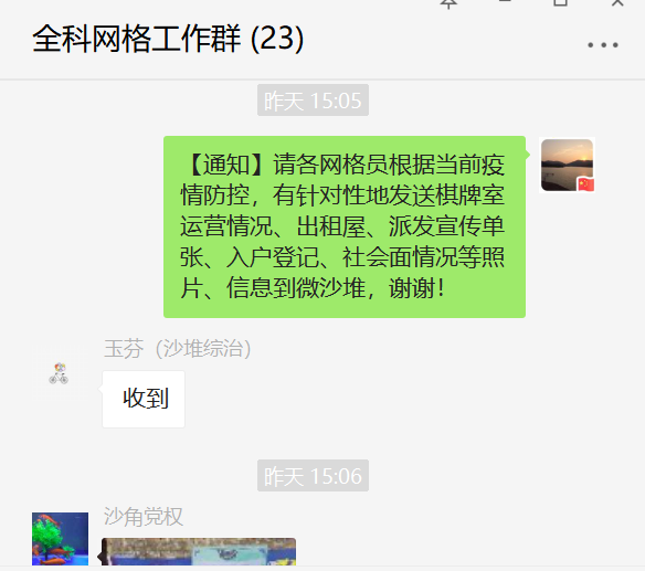 发动系统网格员、村(社区)专、兼职网格员、义工齐上阵,落实43个网格宣传发动、巡查登记,及时通过“微沙堆”上报疫情信息,防疫期间共收到信息96条,处理信息96条,落实当天信息当天处置,及时处置率100%。