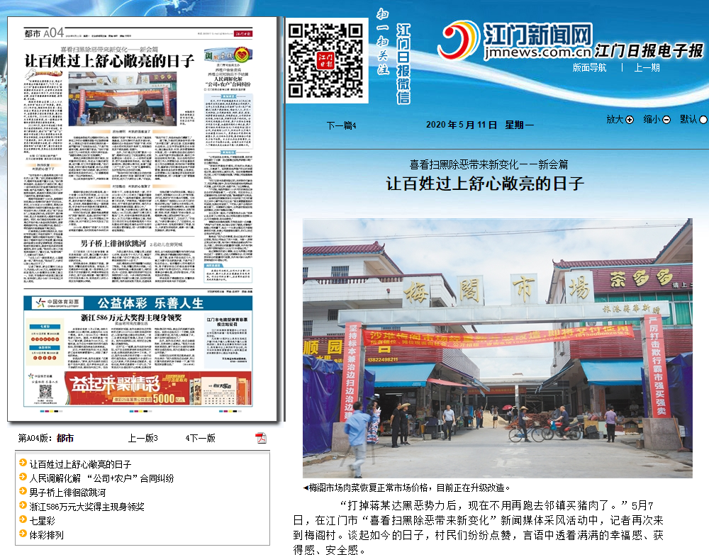 “打掉蒋某达黑恶势力后,现在不用再跑去邻镇买猪肉了。”5月7日,在江门市“喜看扫黑除恶带来新变化”新闻媒体采风活动中,记者再次来到梅阁村。谈起如今的日子,村民们纷纷点赞,言语中透着满满的幸福感、获得感、安全感。
