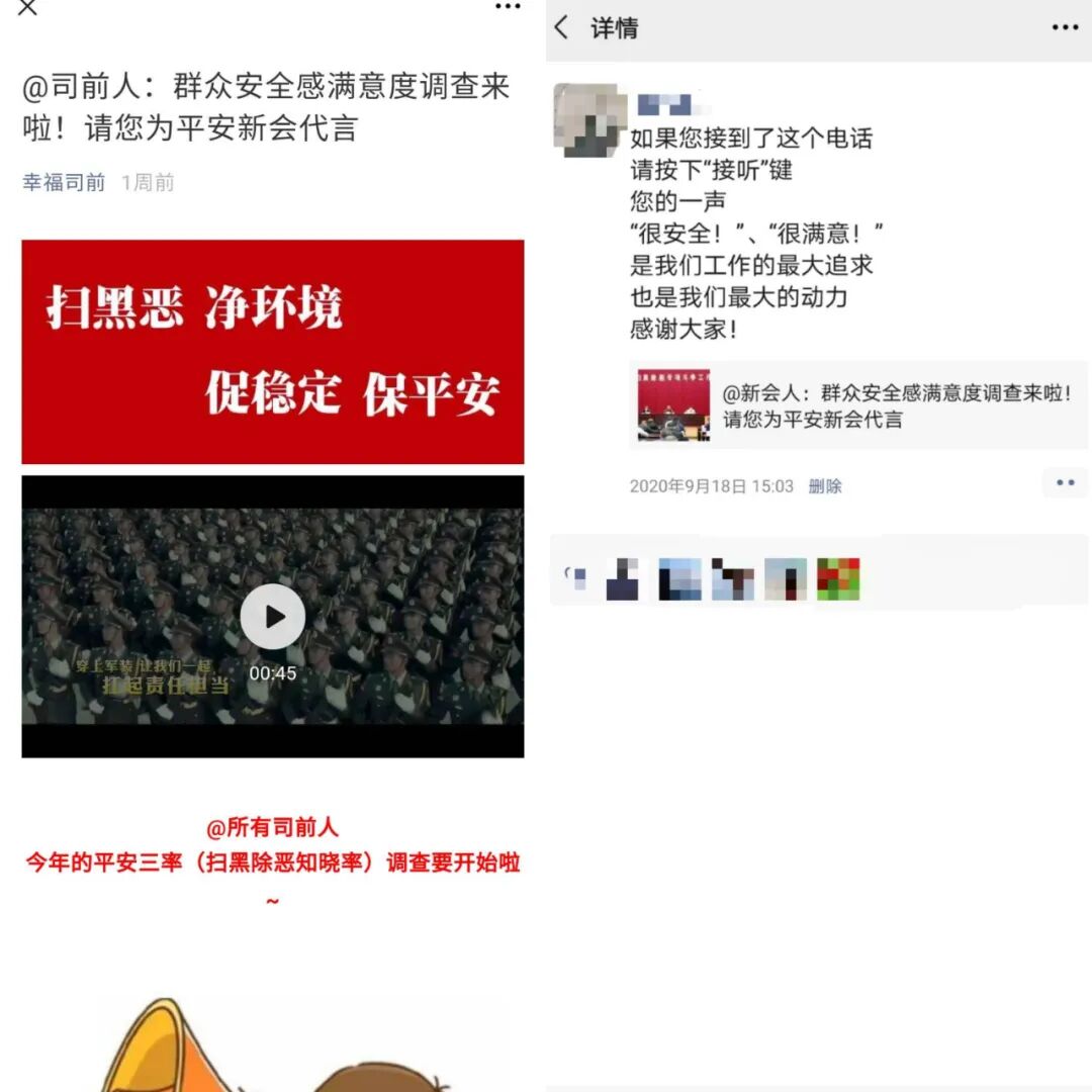 为进一步扩大平安三率宣传覆盖面,司前镇着力发挥新媒体的传播优势,积极发动镇、村两级干部通过微信宣传矩阵,及时将平安三率有关内容转发到工作群、朋友圈,并动员他们发动身边的群众积极参与群众安全感满意度调查活动中。
